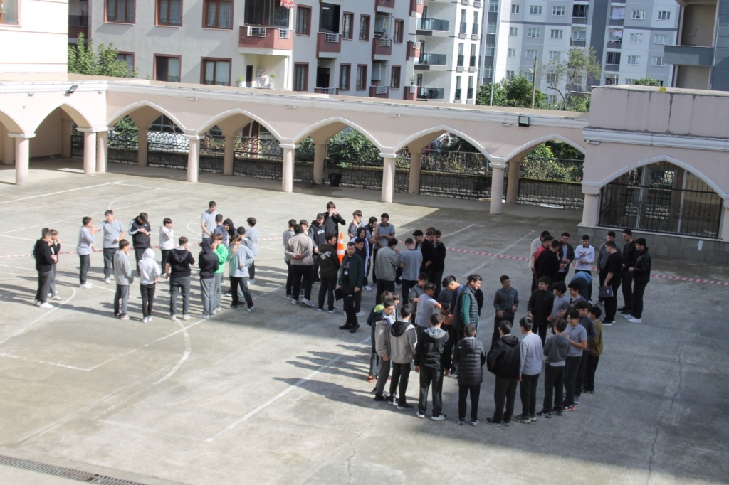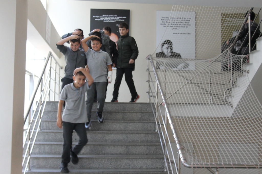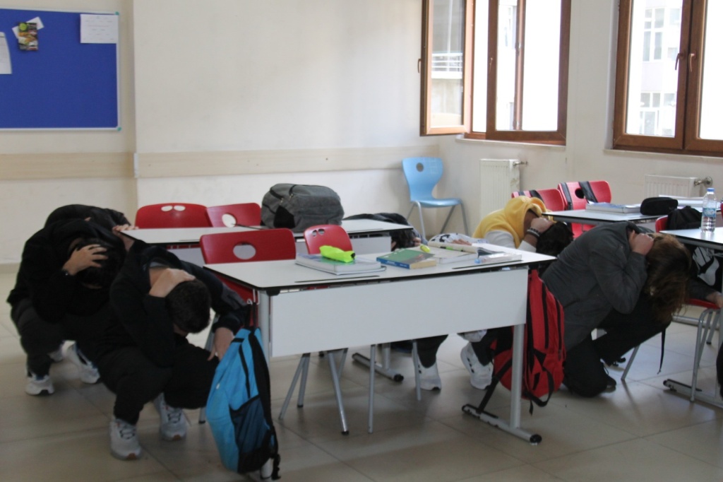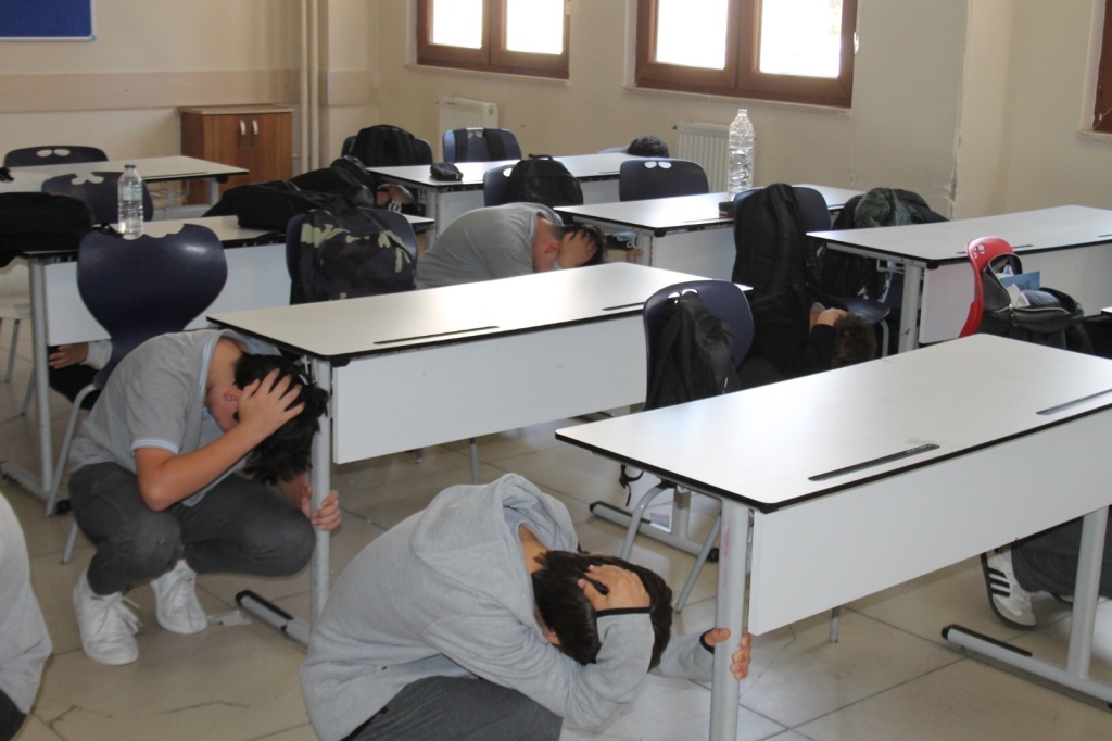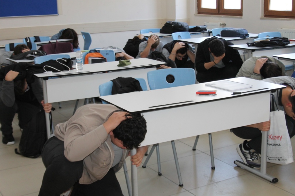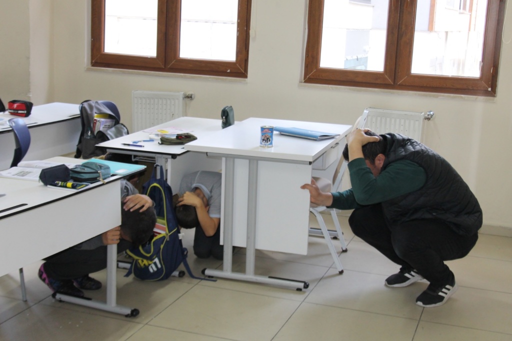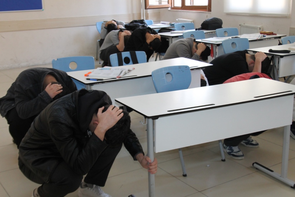 Tatbikat sırasında öğrenciler, sınıflarında güvenli alanlara geçerek çök, kapan, tutun hareketini yaptı. Ardından öğretmenlerinin yönlendirmesiyle düzenli şekilde toplanma alanına çıktılar.