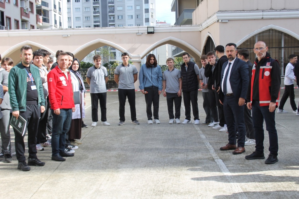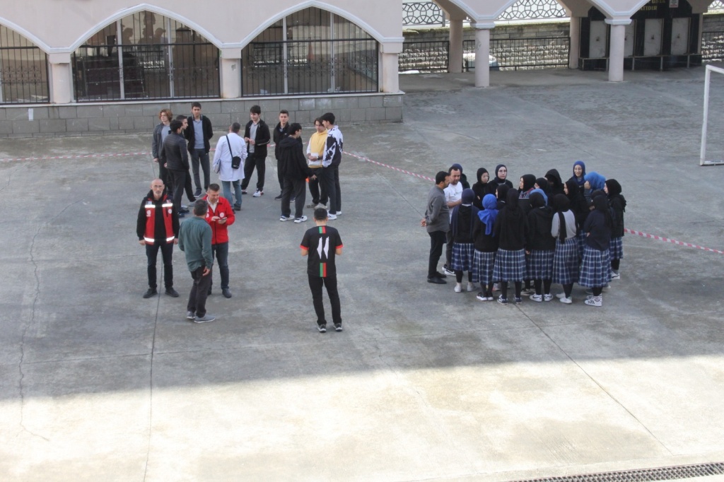13 Ekim Dünya Afet Risklerinin Azaltılması Günü dolayısıyla Rize Anadolu İmam Hatip Lisesi’nde deprem tatbikatı yapıldı. Öğrenciler ve öğretmenler, “Çök–Kapan–Tutun” uygulamasını hayata geçirerek olası bir deprem anında nasıl davranmaları gerektiğini uygulamalı olarak öğrendiler.